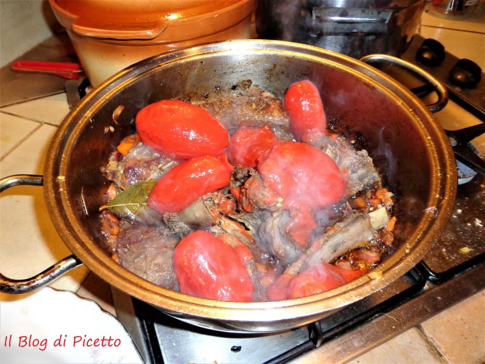 Vado avanti così finché non inizia a rosolare sfrigolando e attacchicchiando, a quel punto metto un po’ vino rosso, buono mi raccomando, “…perché se lo vuoi bere buono te perché lo vuoi dare cattivo al cinghiale?” …che faccio sfumare completamente, poi qualche pomodoro pelato spiaccicato per benino che faccio fondere con il tutto continuando la cottura.